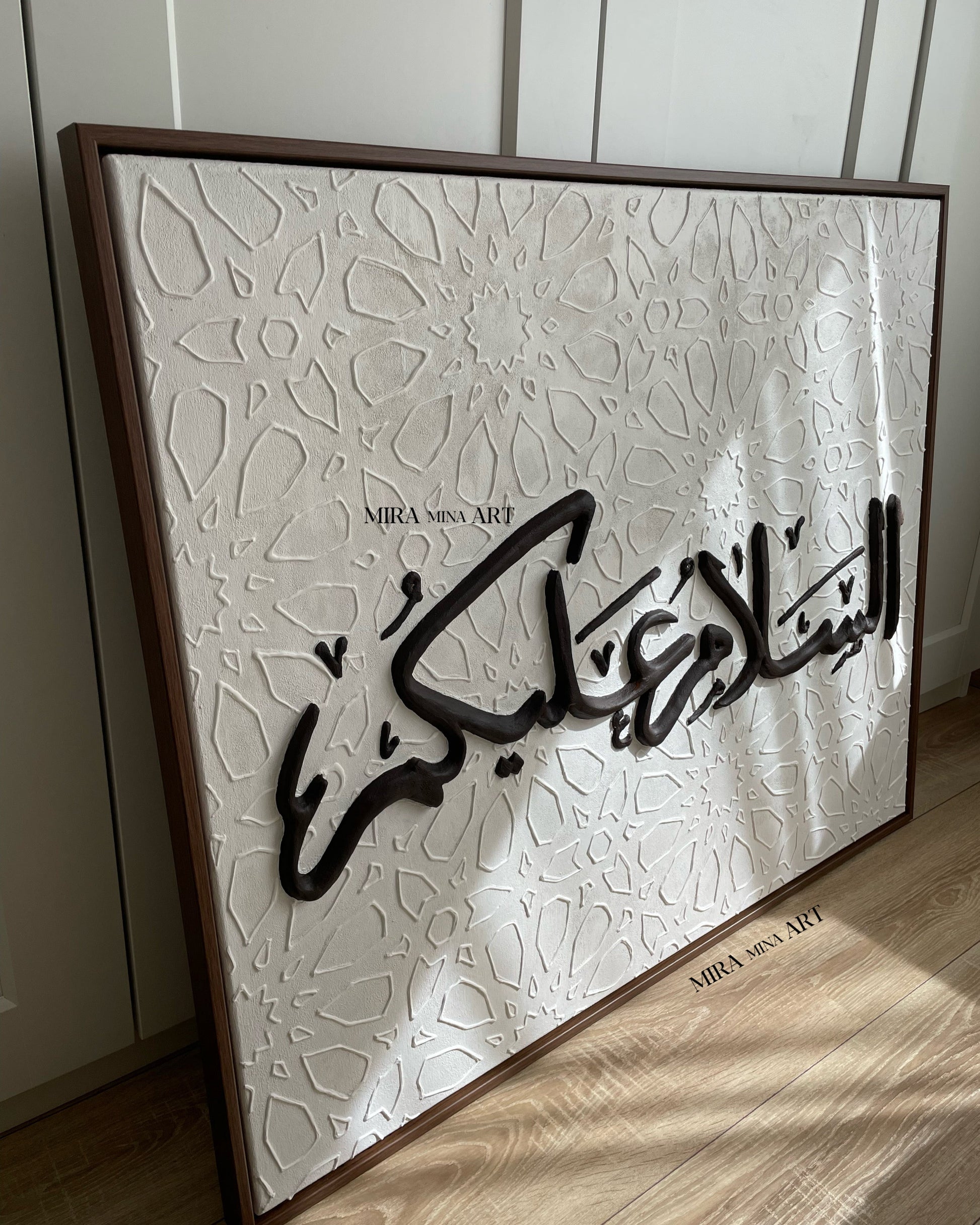 Bringe eine besondere Atmosphäre von Frieden und Eleganz in dein Zuhause: Dieses einzigartige, handgefertigte Originalgemälde zeigt den arabischen Schriftzug „Assalamu alaikum“ („Friede sei mit dir“) und vereint relegiöse Bedeutung mit kunstvoller Gestaltung.