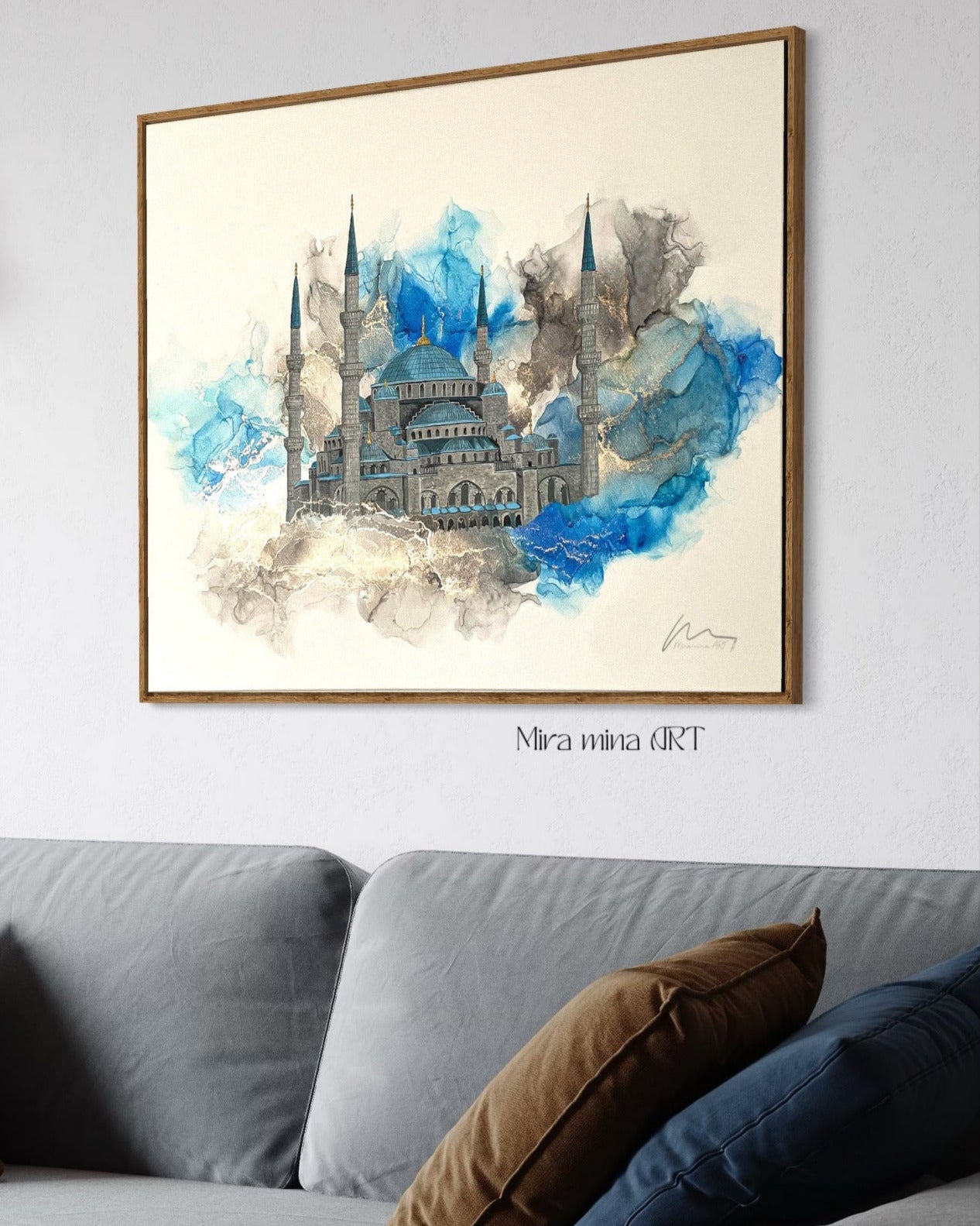 Die goldenen Farbreflexe im Hintergrund spiegeln sich im Licht wunderschön wieder und dadurch wirkt die Moschee noch dreidemensionaler und ist in jedem Raum ein wahrer Hingucker.